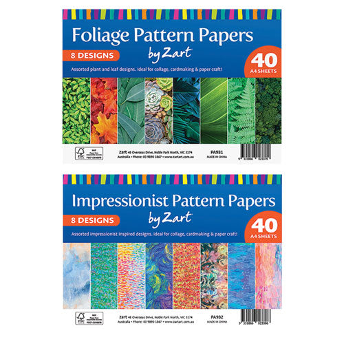 Pattern Papers A4 Foliage 40's is a beautiful collection of high-quality prints, each capturing the essence of a variety of plants and foliage from unique angles and perspectives. This pack includes eight distinct designs: warm vibrant autumn leaves, ferns, a close-up of a banana leaf, assorted palms, Australian Gum leaves, succulents, an aerial view of a forest, and small shrubbery.