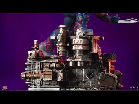 Der wilde kanadische Mutant erklimmt ein technologisches Podest voller Stahlleitungen und elektronischer Komponenten, zieht mit wütendem Gesicht die Krallen seiner rechten Faust aus der Scheide, die mit dem unzerstörbaren Metall Adamantium (einer fiktiven Legierung) beschichtet sind, und zieht seine größte Narbe in seine linke Faust , der Hand, die er im Kampf verloren hat. Mit einer rot-blauen Variante seines ursprünglichen Kostüms und seinem noch längeren, eigenartigen und unordentlichen Haar, das einer Katzenmähne ähnelt, übernimmt er in dieser anderen Realität seinen ursprünglichen Codenamen als endgültigen. Iron Studios bringt die Statue „Weapon