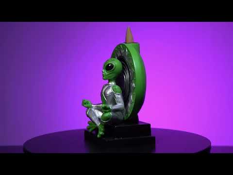 Backflow incense burner with quirky hippie alien design. Alien wears a blue and purple headpiece featuring a gold peace symbol. Fragrant smoke flows down and out of the alien's mouth onto a vibrant flower when a lit incense cone is placed on top. Suitable for incense cones.