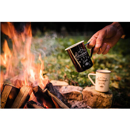 Ensemble de deux grandes versions de la tasse d'émail matériel des messieurs classiques. Livré en crème et en noir. Se lit "L'aventure commence" et "l'aventure ne se termine jamais" respectivement.
