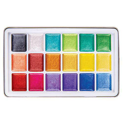 Primecolours Pearlescent Watercolours are vibrant metallic pigments in semi-moist watercolour pans - just add water! These luscious, intermixable semi-wet watercolours -allows the student or artist to enjoy the quality of artist tube paint, but with the convenience and value of a portable palette set. These watercolours are semi-dried, contain less filler and are loaded with metallic pigment, which results in a stronger, clean and more saturated colour.