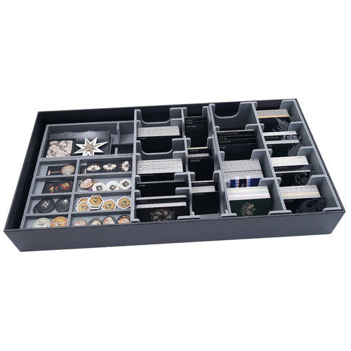 The insert is arranged in up to three layers. This product also includes two cardboard tuck boxes for storing separately the hexagon map tiles.