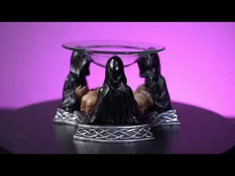 Upiorne Grim Reaper Burner z szklanym naczyniem. Uchwyt Tealight otoczony czaszkami. Ma celtycki wzór węzła wokół podstawowej krawędzi.