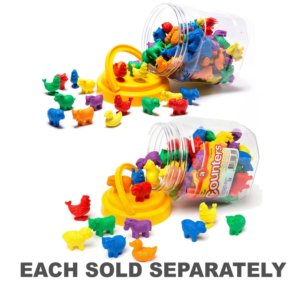 The Counters Farm Animal Jar includes 108 colourful counters, representing six different types of farm animals, in six distinct colours. The variety of shapes and colours makes these counters an excellent tool for a range of learning activities, such as naming and counting animals, matching colours, or sorting by animal type.